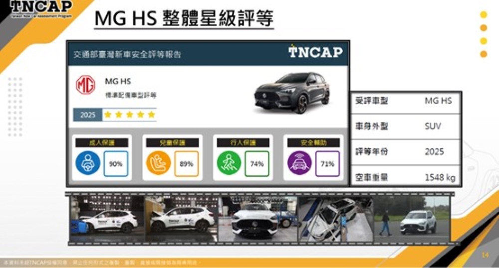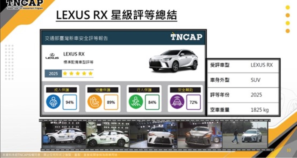 為提供消費者新車安全資訊,促使車輛產業升級,臺灣新車安全評等計畫(TNCAP)今(30)日正式TNCAP 114年第三季三車型的評等結果:LEXUS RX 獲得五顆星評等、TOYOTA TOWN ACE獲得零顆星評等、MG HS獲得五顆星評等。