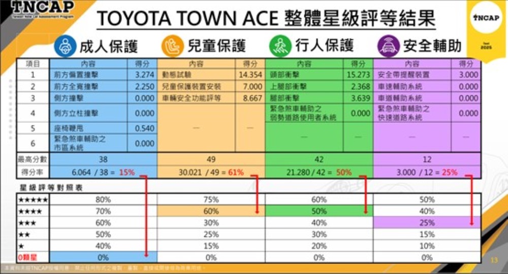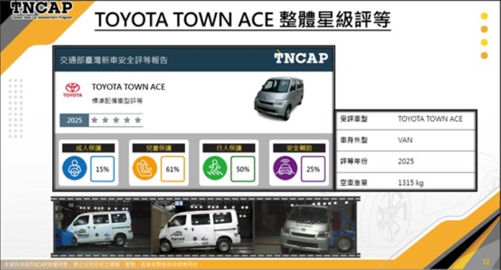 對於從去年公告今年將實測第一部客貨兩用廂型車,相信商用車主應該都十分關注,畢竟安全是出勤最基礎的後盾。對於國內第一次評等出現0顆星的結果,讓在場媒體都頗為震撼,進一步詢問這樣的結果廠商是否會有任何改善或者這款車在海外其他地區是否也有進行評測的結果。VSCC車安中心周為果執行長表示,這樣的結果是代表僅符合國內車輛安全法規基本要求,這種0星等得評測結果在其他NCAP也曾出現,不過TOWN ACE只有台灣將他放進小客貨車級距進行評量,因此沒有其他地區的結果可以比較。畢竟TOWN ACE是台灣近年銷售長虹的商用車款,數萬頭家們愛用,因此此評等結果,希望讓更多商用車主了解,也期待車廠更積極提供商用車更完善的安全防護。