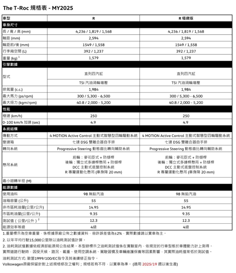 The new T-Roc R極緻版設計俐落簡潔,銳利折線與R 專屬外觀 / Black Style 黑化套件刻劃氣勢萬鈞的戰鬥姿態,車頭具R 專屬運動化前保桿,以水箱護罩連貫式 LED 定位燈連結兩側IQ.LIGHT 智慧燈組:LED Matrix 矩陣式頭燈和 DLA 動態頭燈自動切換,前方與側邊綴上辨識度極高的R 徽飾及R專屬銘牌,自黑化風格後視鏡罩、湛黑車頂行李架,至黑化風格窗框、後方深色隱私玻璃與碳纖維風格 C 柱設計,無處不以細節展現強烈張力和卓越質感,流線輪廓延伸至車尾斜背造型與LED高亮度燻黑尾燈(附動態轉向指示燈),由運動化雙邊四出排氣尾管及黑化風格排氣飾框勾勒出霸氣背影,此次新增R 極緻版專屬套件更是如虎添翼,純粹而具未來感的「金屬流光銀」車色,搭配專屬 19 Pretoria 鋁合金輪圈,外觀簡約洗鍊卻蘊藏強勁動能的反差魅力讓人愛不釋手,輕鬆悠遊於日常都會和帥氣跑格之間。而由台灣福斯汽車初次在台獻上的Volkswagen R部門限定色,嶄新「霧影消光灰」車色套件,沉穩大器的身姿低調而高貴,佐以黑色車門把手畫龍點睛,流露與生俱來無法掩蓋的剛烈鋒芒,展現非凡個人品味同時強化運動操駕體驗。