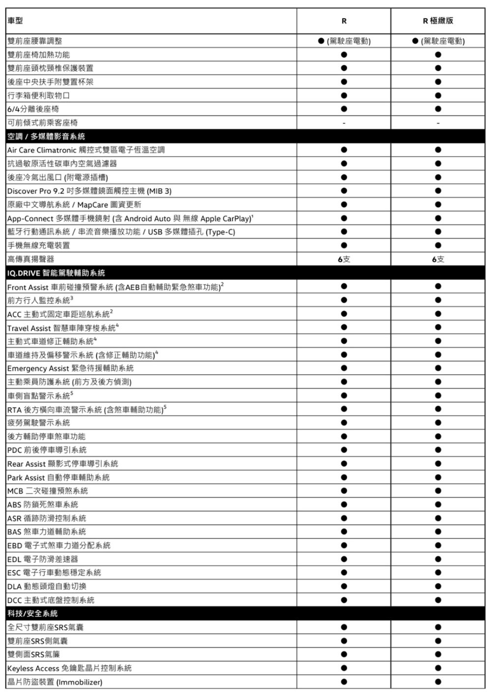 作為令人安心的可靠後盾,The new T-Roc R極緻版具有豐富的主被動安全科技和完善的IQ.DRIVE 智能駕駛輔助系統:Travel Assist 智慧車陣穿梭系統整合全速域 ACC 主動式固定車距巡航系統、車道維持及偏移警示系統(含修正輔助功能)和主動式車道修正輔助系統,有效減輕駕駛負擔,配合主動乘員防護系統(前方及後方偵測)、Front Assist 車前碰撞預警系統(含AEB自動輔助緊急煞車功能)、車側盲點警示系統、RTA後方橫向車流警示系統(含煞車輔助功能)、MCB二次碰撞預煞系統與6SRS安全輔助氣囊,全方位守護每次無憂的平安出行。