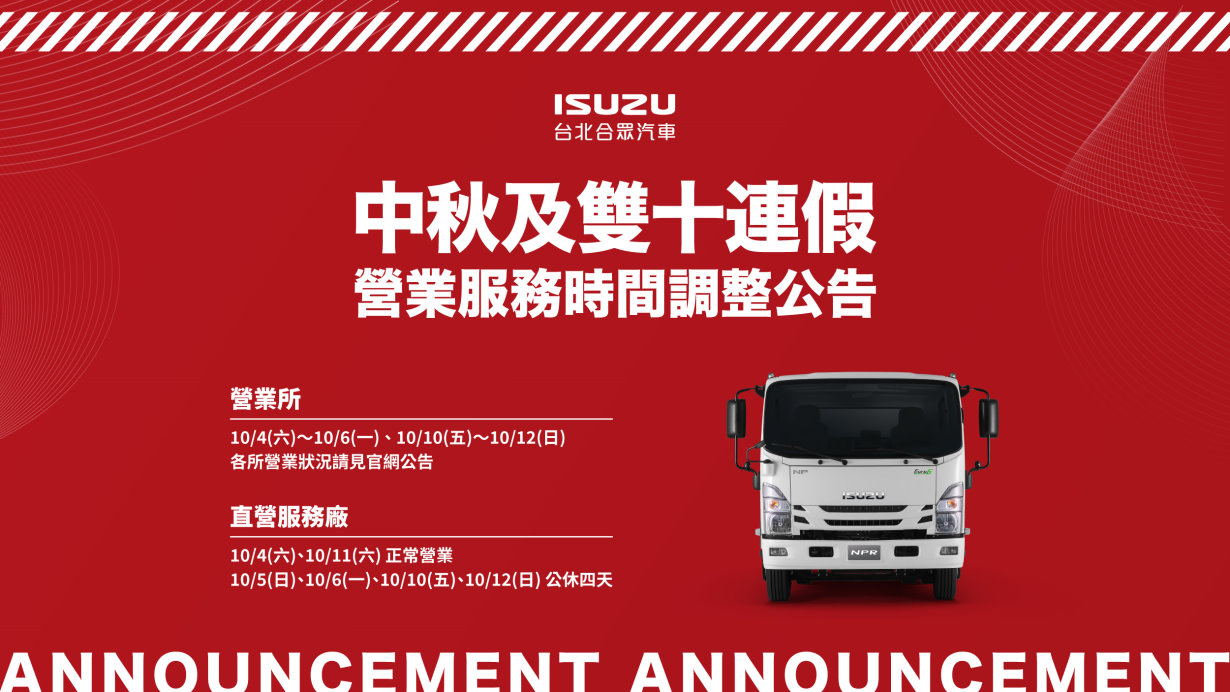 另提供直營服務廠「中秋」與「雙十節」連假