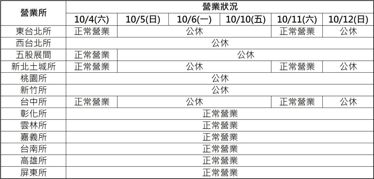 10/5(日)、10/6(一)、10/10(五)、10/12(日) 全台公休四天
