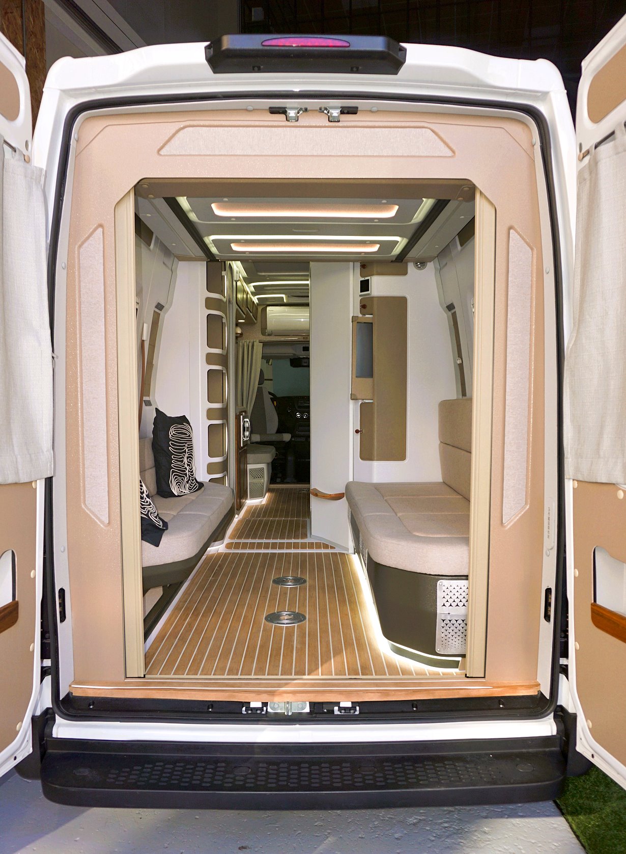 對於材質來說,「Three-Maker三作藏品製作所」要求更高,諸如與豪華遊艇完全相同、防潮不怕水,即使沾濕了也要容易清理,同時具備防滑安全觸感耐磨地板,以及裝飾木材均選用防潮不怕水的柚木,還有豪華休閒客層幾乎已經不可或缺的「免治馬桶」都是標配,當然與時下行動生活無縫接軌、可藉由專屬App控制全車多數機能的軟體介面等等...都必須真正符合日常從社交到休閒生活各種需求,方方面面都要滿足國人的高標準才行...所以這「回歸核心」的思維,所打造出的「敏مين -Min」儘管是IVECO Daily H2長軸高頂規格,但整車總重居然可控制在3368kg(這也表示短軸會更輕盈!),要降低駕駛時的負載,且需讓容易操控、乘坐舒適與節能減碳等都要達到「Three-Maker三作藏品製作所」所設定的最高標準。