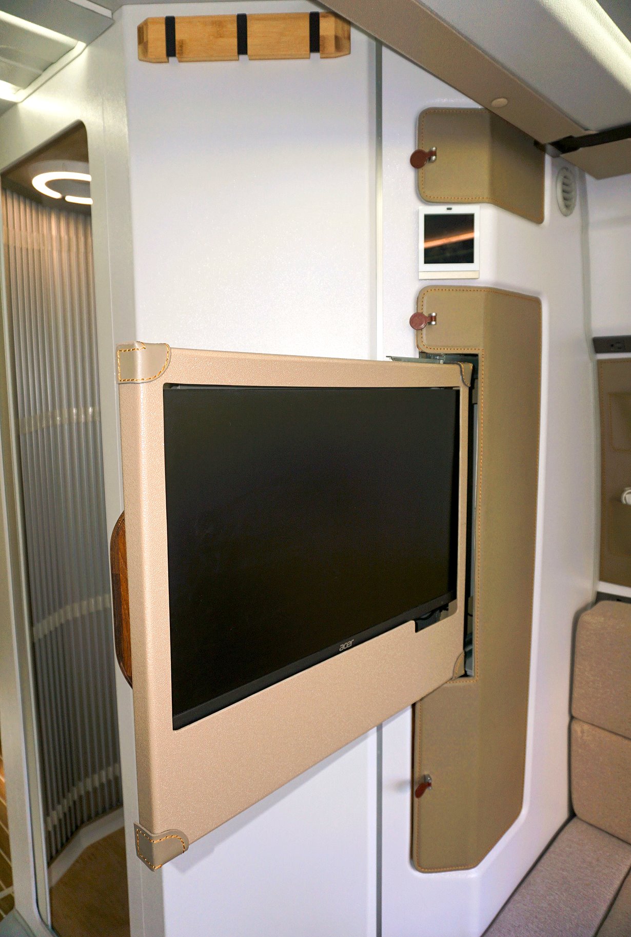 「敏مين -Min-旅行者的守護神」艙內說是頂尖時尚豪華精品等級無庸置疑-連可收納式的視聽螢幕,都採用了時尚頂尖真皮精品等級的工法加以呈現。