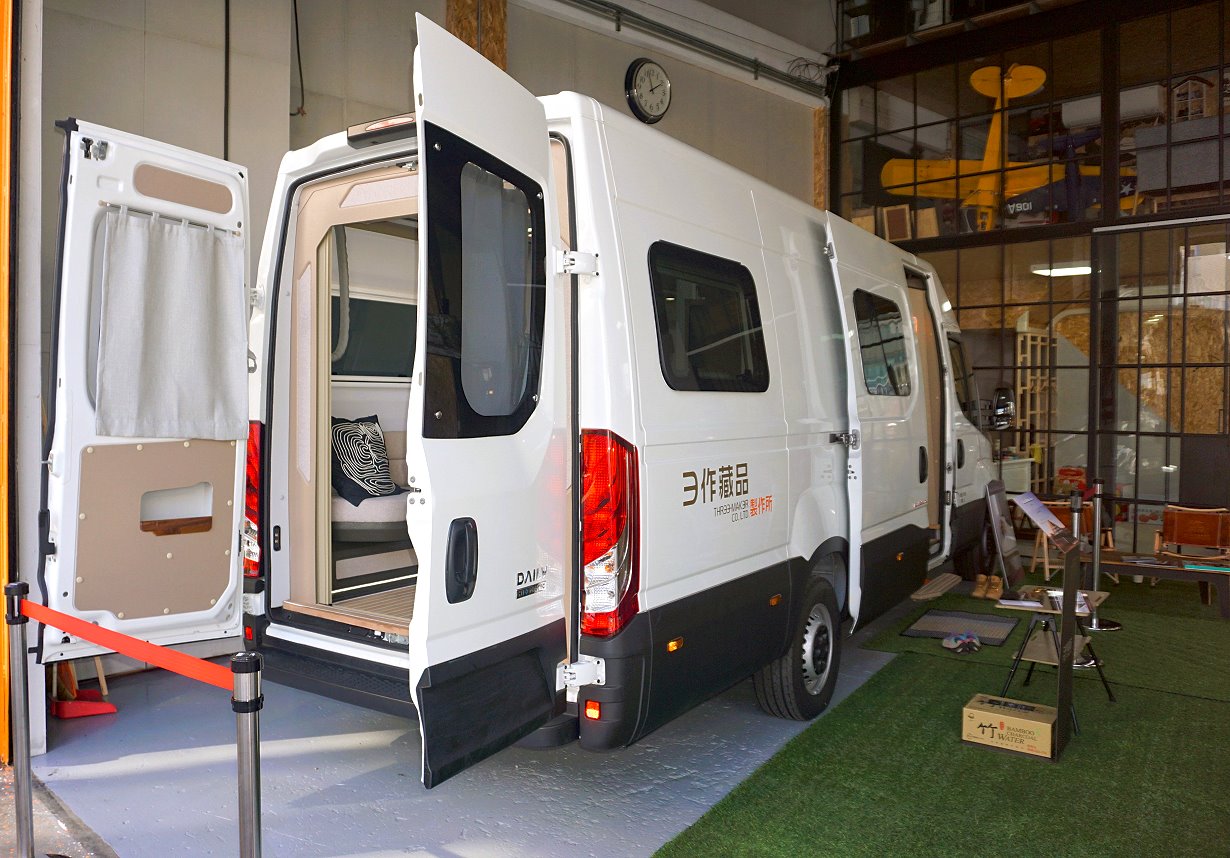 「Three-Maker三作藏品製作所」匠作職人魏先生向「商用車談ChatCV」採訪團隊表示,這款稱為「敏مين -Min」(取自希臘文「旅行的守護神」之意!)的IVECO Daily H2自走式露營車,他其實比較想稱之為「旅行車」,因為台灣屬於多都會環境,儘管當前大家對自走式露營車的印象,都覺得一定要有「可掀式車頂」或「車邊帳」等等元素,但對他來說,他認為真正購買或較常用到這類車款的消費族群,其實更需要一款在機能上,更接近其豪華居所一般的行動車輛,所以在外觀上「敏مين -Min」幾乎與原款廂式貨車沒有太大差別,重要的是比一般露營車機能,更著重高品質的車室空間享受與到位的收納機能。