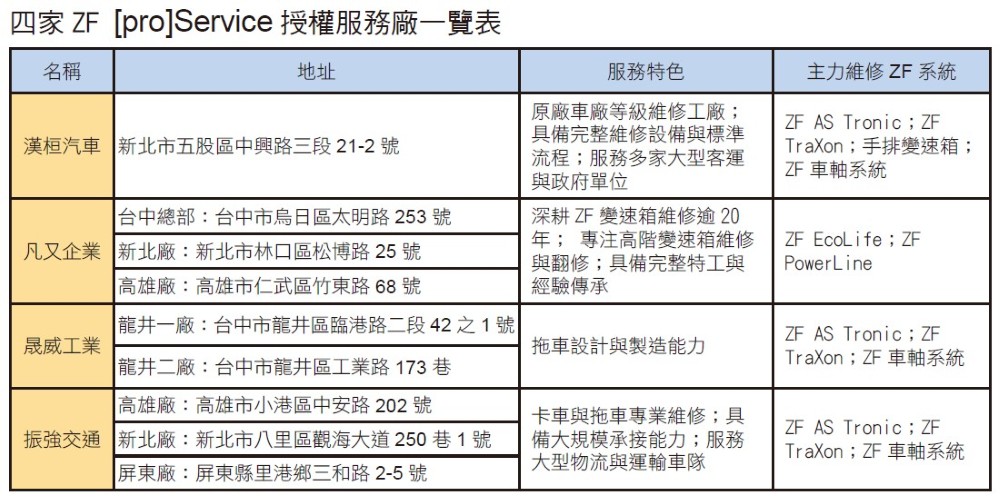 目前 ZF 在台灣已完成授權的四家[pro]Service 服務廠,分布於北中南主要運輸節點,形成具備即時應變能力的維修網絡,其維修量能得以有效分散並貼近車主實際營運場域。