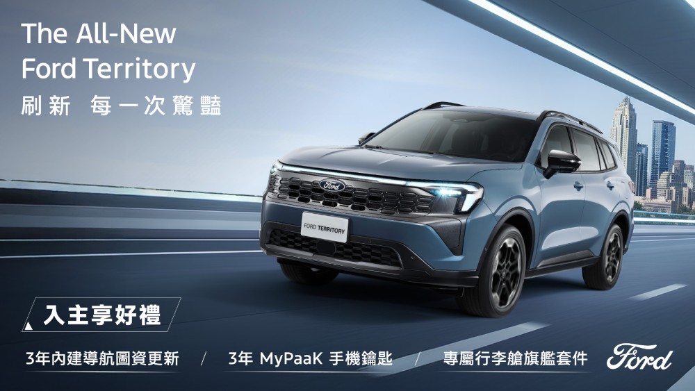 在空間與安全方面,The All-New Ford Territory擁有2,726mm軸距與同級唯一後座平整地板設計,提供充裕頭部與膝部空間,多達22處置物空間與1,150mm後行李廂開口,搭配6/4分離椅背及足踢感應電動尾門,滿足家庭日常與出遊需求。安全科技上,配備Ford Co-Pilot360™ Drive+全方位智駕科技輔助系統,包括360環景影像行車輔助系統、FAPA主動式停車輔助系統5.0LRAS循跡倒車輔助功能,結合超過65%超高強度鋼材車體、熱成型高強度一體式門框及AB柱硼鋼強化,守護全家每一次出行。