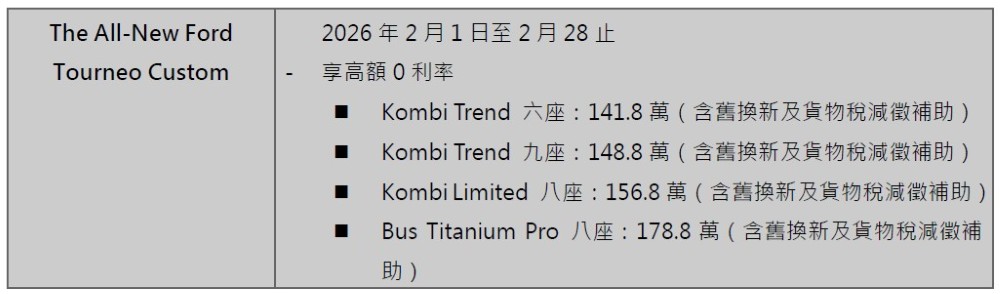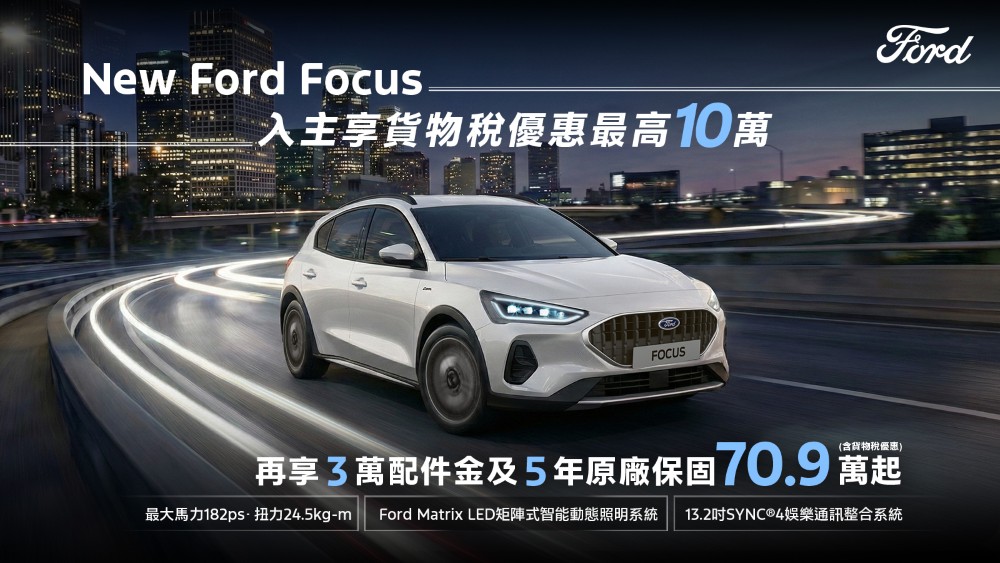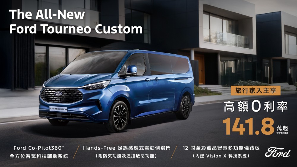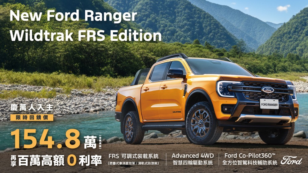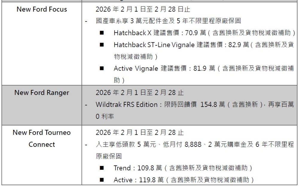 歐洲超能智駕跑旅The All-New Ford Kuga採用1.5T EcoBoost®渦輪增壓汽油引擎,經專屬調校可輸出187ps的強勁動力,帶來隨心暢快的駕馭體驗,入主享力挺價83.9萬起(含舊換新),加碼高額分期0利率及5年原廠保固;New Ford Ranger Wildtrak FRS Edition搭配全新FRS可調式裝載系統,提供靈活裝載空間,無論工作還是休閒,都能從容應對各種情境,入主即享限時回饋價154.8萬(含舊換新),及百萬0利率;New Ford Focus擁有動感外型與德規底盤調校,入主享貨物稅優惠價70.9萬起,再加碼3萬元配件金及5年原廠保固;歐洲進口正七人座New Ford Tourneo Connect福特旅玩家,享貨物稅優惠價109.8萬起,再加碼2萬元購車金、低頭款5萬、低月付8,8886年不限里程原廠保固〔註四〕;歐洲首選國際商旅The All-New Ford Tourneo Custom福特旅行家,享貨物稅優惠價141.8萬元起,入主再享高額0利率。