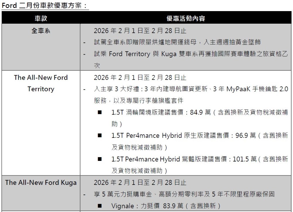 馬年迎春駕好運,福特六和春節限時優惠正式開跑!自202621日起至228日止,至全台Ford展示中心試駕任一車款,即可獲得限量烘爐地開運錢母,入主週週抽黃金墜飾;此外,「TEAM FORD SUV 雙戰力點燃你的經典名場面」活動同步展開,活動期間試駕The All-New Ford TerritoryThe All-New Ford Kuga雙車系,即可獲得「國際賽車體驗之旅」抽獎資格乙次〔註一〕。入主The All-New Ford Territory享優惠價84.9萬起(含舊換新及貨物稅減徵補助),再加碼提供三大好禮:3年內建導航圖資更新、3MyPaaK手機鑰匙2.0服務,以及專屬行李艙旗艦套件;入主The All-New Ford Kuga 1.5T享力挺價83.9萬(含舊換新),內含5萬元力挺購車金〔註二〕、高額0利率及5年原廠保固〔註三〕;為回應市場熱烈支持,New Ford Ranger Wildtrak推出限時回饋價154.8萬(含舊換新),再享百萬0利率;福特六和以多元購車方案喜迎農曆新年,邀請消費者把握新春購車好時機,啟動嶄新駕馭篇章。