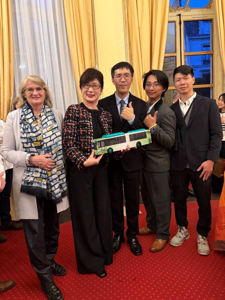 此外,活動中亦巧遇正規劃於敦克爾克建置固態電池工廠的輝能集團高層,雙方就多元供應鏈與未來合作可能性進行交流。會後,氫谷動能亦代表董事長致贈氫能巴士模型予代表處郝大使,並邀請其於後續 OPmobility 新模組交付與安裝測試階段,前往實地參觀氫能巴士。