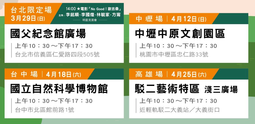 四場活動將依序於全台展開,時間皆為上午10點30分至下午5點30分,地點涵蓋主要都會區與指標性場域:台北場於3月29日於國父紀念館廣場舉行;中壢場為4月12日於中壢中原文創園區;台中場於4月18日在國立自然科學博物館;高雄場則於4月25日在駁二藝術特區淺三廣場登場。