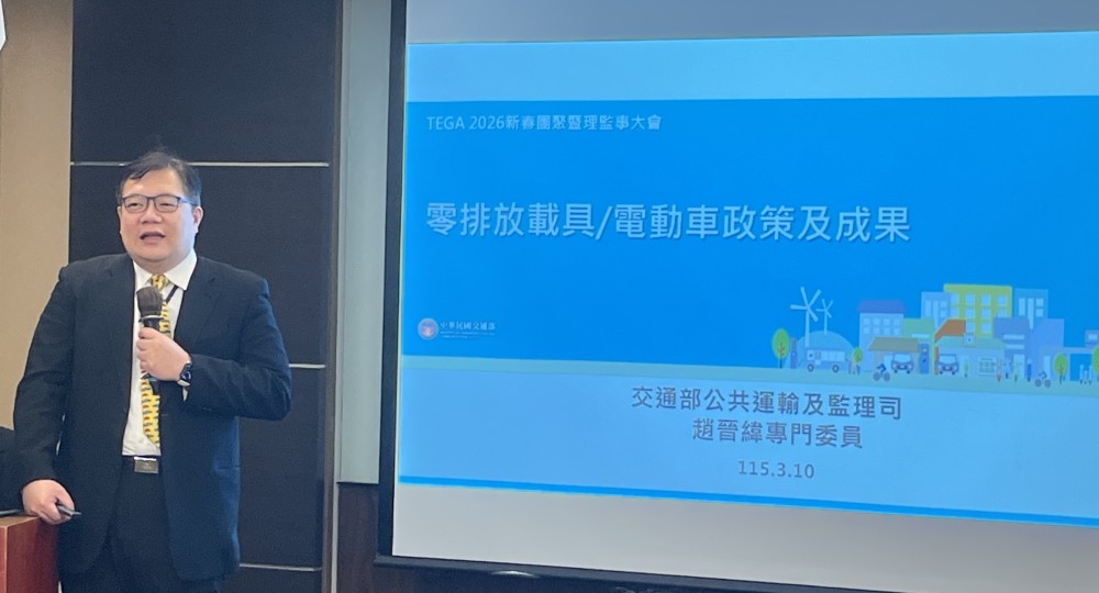 台灣智慧電動車及綠能科技協會(TEGA)日前(310)於台中全國大飯店舉辦「2026新春座談」,邀集政府單位與新能源車產業代表齊聚交流。座談會以「電動車政策與成果」為主軸,由交通部專門委員趙晉緯分享運具電動化政策推動進度,並邀請氫谷動能、東元電機、華城綠能與華德動能等企業代表,從氫能載具、電動商用車與動力系統等不同面向探討產業發展。