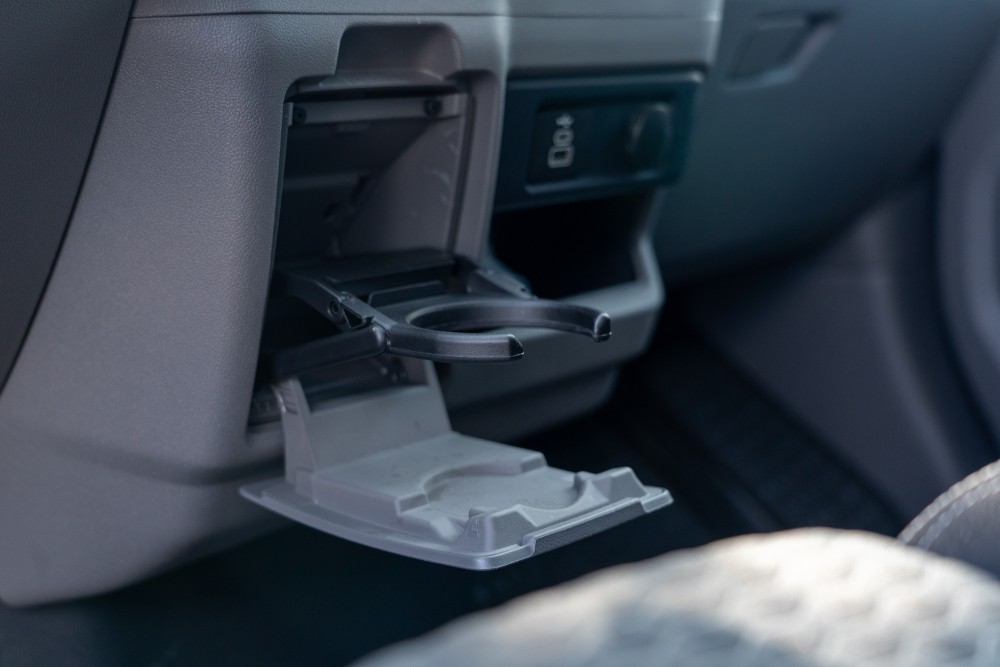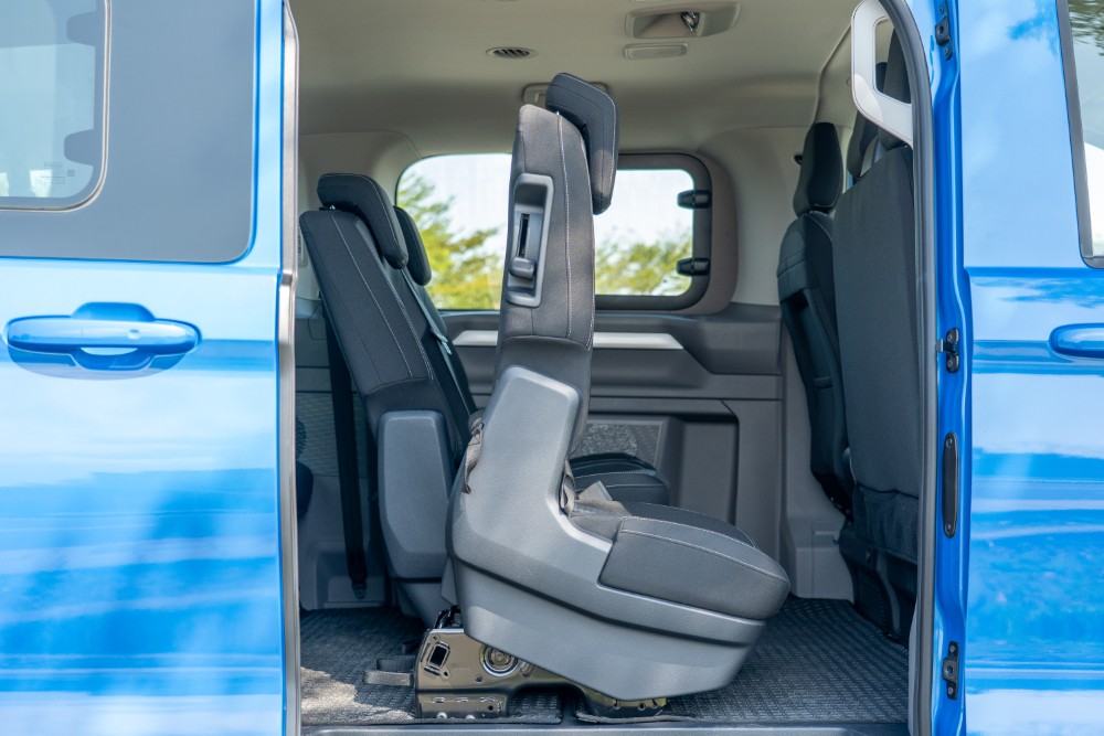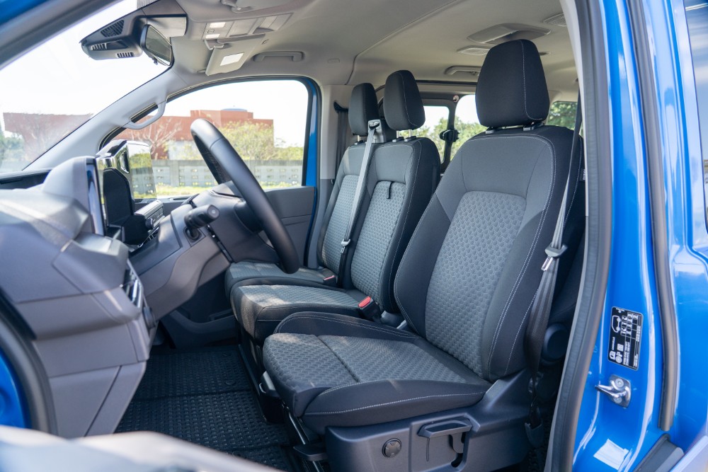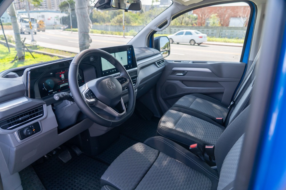 空間始終是 Caravelle 能在商務接送領域屹立不搖的核心競爭力,Life 170 在長達 5,450mm 的車身與 3,500mm 的軸距內,創造了極大化的空間容積。在座椅佈局上,副駕駛座採用了雙人座椅配置,除了能增加載客數外,還巧妙地整合了中央摺疊多功能桌與座椅下方的置物空間,為司機提供了放置票據或零錢的收納處。駕駛座則具備 8 向手動調整功能,並且額外標配電動腰靠,確保了職業駕駛在長工時下的體型支撐。